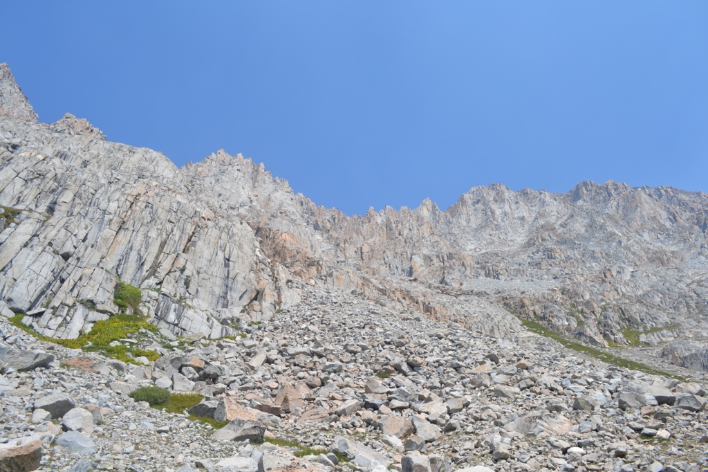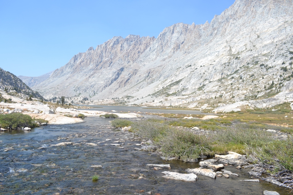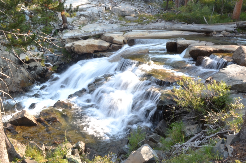 After lunch we followed the trail around Evolution Lake for a mile or so, then we hiked past Sapphire Lake and an unnamed lake. That section of the trail was one of my favorites – alpine lakes, jagged peaks, waterfalls and cascades… however it was HOT and very exposed. With my heavy pack I started to fatigue quickly in the sun with very limited shade. Luckily I had a good sun hat or I would’ve been toast.