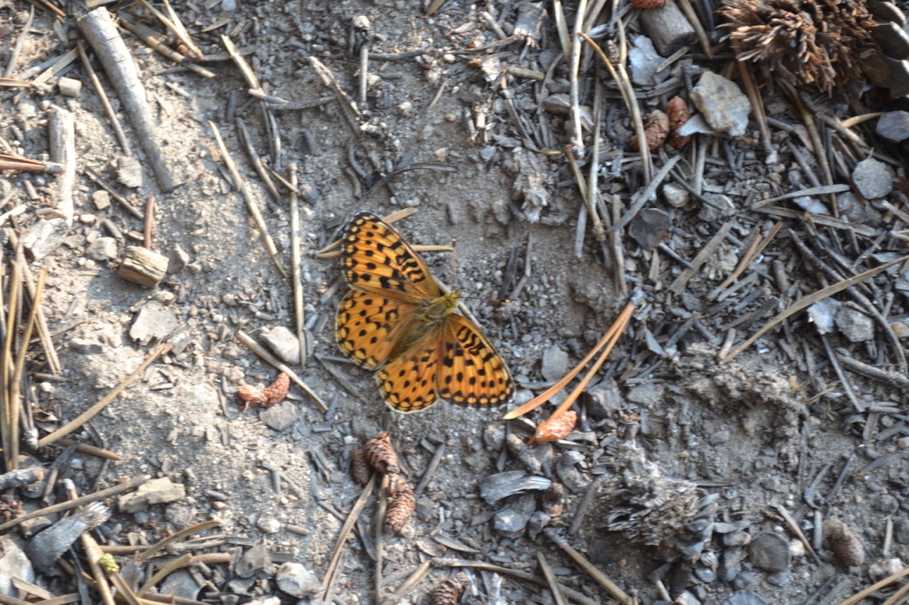 We decided to meet for lunch at Evolution Lake, 1000ft higher and 4 miles away. The first section was a gradual climb through more meadows but then we reached very steep, hot, dusty switchbacks. The view was worth it though, slowly climbing to the height of neighboring peaks visible from the lower valleys earlier. To the east a group of spectacular cliffs and peaks appeared and we came upon Evolution Lake [124.5 mi, 10860’] below them. This might’ve been the best view of the trip. The lake was just barely below the tree line so there were a few small pockets of trees. We had lunch in the shade of one. For the first time at lunch I actually removed my boots to soak my feet in the lake. Small trout swam by and the water was crystal clear. There was another large group up there jumping from cliffs into the lake.