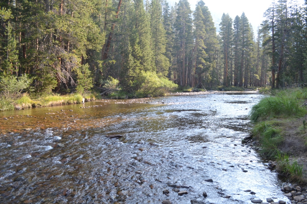 We started off with a steep climb up some switch backs. Luckily we were in the shade but each turn provided wider panoramic views of Kings Canyon and the opposing rock face which was cracked with waterfalls. About half way up the switchbacks we started walking along Evolution Creek which had stunning falls and cascades down the mountain. It made the steep slope a lot more enjoyable. We eventually reached the notorious creek ford [116.6 mi, 9190’], our first real crossing of the trip. I switched to sandals to avoid dis-lodging my duct-tape repaired shoe, although the creek was only just higher than my boots and not swift at all. Apparently the ford can be pretty dangerous earlier in the season and you have to go higher up to the meadow before crossing.