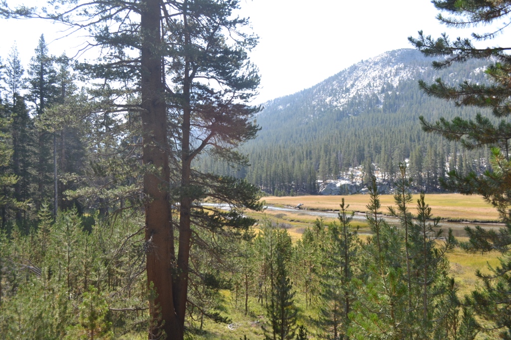 We continued along the creek through Evolution and McClure Meadows, slowly gaining elevation. The meadows were beautiful and green with the creek flowing through, surrounded by trees and peaks. We took a quick snack break at the McClure Meadow Ranger Station [119.1 mi, 9630’] which was a cute log building in the middle of the trail/meadow. Nice place to be a ranger!